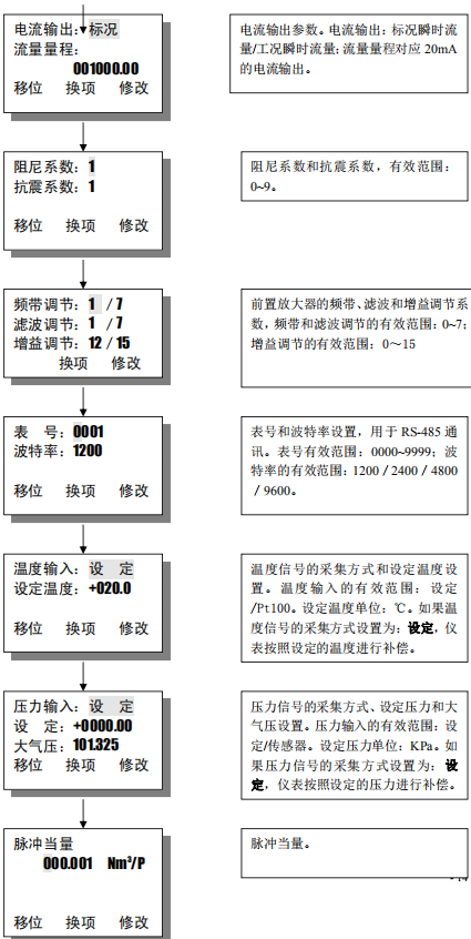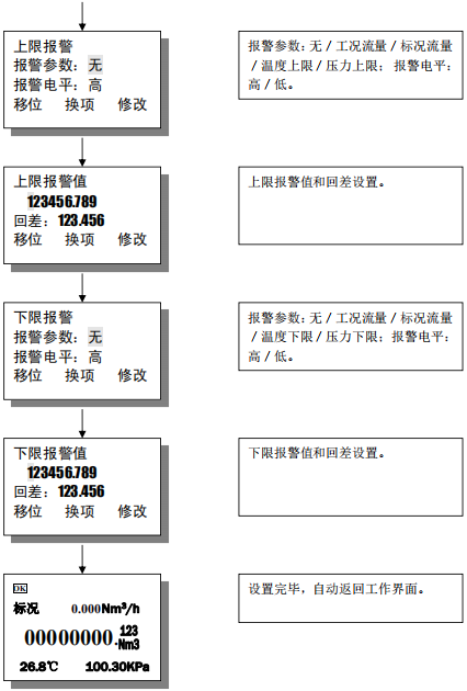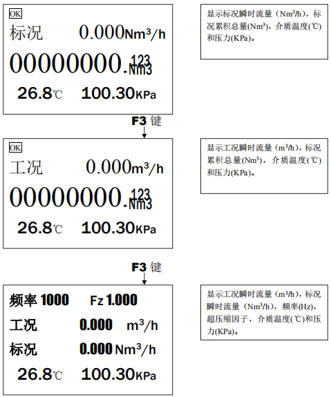 2、瞬时流量可切换显示标况体积流量(Nm3/h)和工况体积流量(m3/h),最多可保留 3 位小数,显示最大值为 9999999;