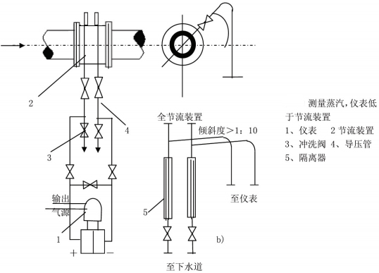 测量蒸汽流量时,安装方式一般为差压变送器低于、高于节流装置两种。取压口位置应附合上述安装要求,并在导压管制高点处装上放气阀和气体收集器。