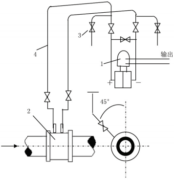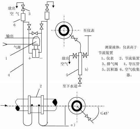 测量液体流量时工艺管道水平安装,差压变送器的位置 处于节流装置下方时,取压口应在节流装置的水平中心 轴线下偏45°角引出,这可以消样除由流体传放出的气体进入导压管和差压变送器。若差压变送器处于节流装置的上方时,除取压口下偏<45°角然后向 上引导压管外,应在导压管 上的最高点装置集器或排气阀。