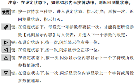共有六个使用键,其中有测量状态使用键和设定状态使用键, 选用优质薄膜触摸式键盘,按键时伴有清脆的蜂音。
