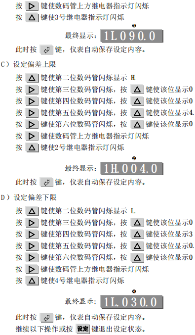 偏差上限是指超过上限的偏差值,实际报警值=上限+偏差上限。例: 上限为115.0℃,偏差上限为4.0℃ 实际报警值=115+4=119℃ 偏差下限是指超过下限的偏差值,实际报警值=下限-偏差下限。