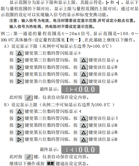 例三:第一通道的量程范围是4~20mA信号,显示范围是-100.0~100.0℃ 记录范围是0.0~150.0℃。