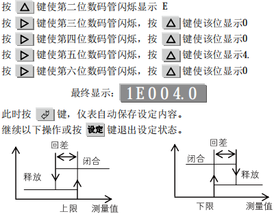 小长图有纸记录仪上下限报警继电器的触点是给用户联接相应的控制电器[如电 磁阀]以组成控制系统时使用。为了防止在报警点附近继电器触点产生抖 动现象,仪表采用设定回差的方法,以消除继电器触点抖动。其提示符是:E