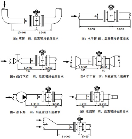 为了改善涡流与流场畸变的影响,流量计安装的前、后直管段长度有一定要求,否则会影响测量精度(也可安装整流器,尽量避免在靠近调节阀和半开阀门之后安装)。