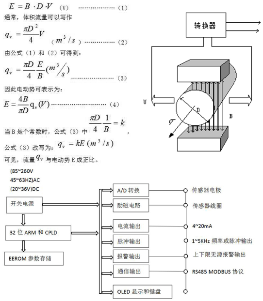 当导电流体以平均流速V通过装有一对测量电极的一根内径的绝缘管子流动时,并且该管子处于一个均匀的磁感应强度为B(T)的磁场中。那么,在一对电极上就会感应出垂直于磁场方和流动方向的电动势(E)。