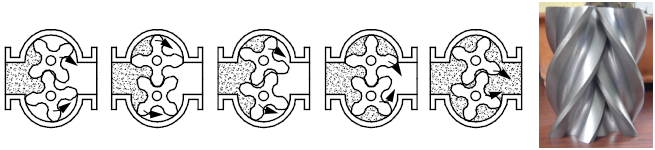 计量室内主要有一对特殊转子与盖板构成的密封空腔作为流量的计量单位。转子靠流量计进出口处的压力差推动而旋转,从而不断地把进口处的液体经密封空腔计量后送到出口处。每转流过的液体量是图中密封腔的八倍,由密封联轴器将转子旋转的总数,以及旋转的快慢传递给计数机构,便有指针显示和字轮累积,即可知道通过管道中液体总量。在计数机构中还可以安装脉冲发信器,即成了带发信的流量计。