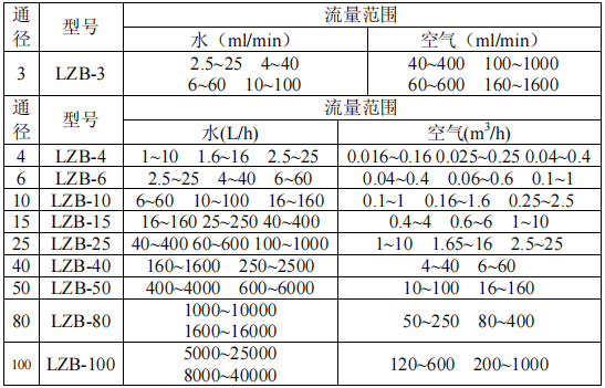 五、普通型玻璃转子流量计量程