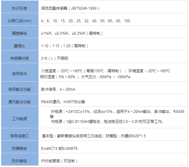 三、卫生型涡轮流量计技术参数