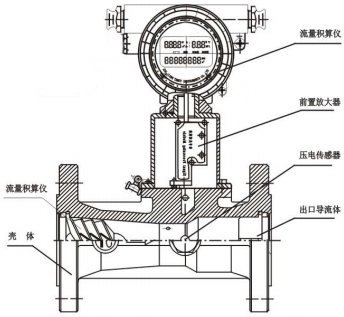 当沿着轴向的流体进入流量计入口时,旋叶强迫流体进行旋转运动,于是在旋涡发生体中心产生旋涡流,旋涡流在文丘利管中旋进,到达收缩段突然节流使旋涡流加速。当旋涡流突然进入扩散段后,因回流的作用强迫进行旋进式二次旋转。如果仪表内部具有最为优化的几何结构,那么在宽量程范围内,旋涡的频率就与流量成正比,并为线性。该频率是由压电传感器检测到的微弱电信号经前置放大器放大、滤波、整形后变成与流量成正比的脉冲信号,最后送往流量积算仪进行运算与处理。