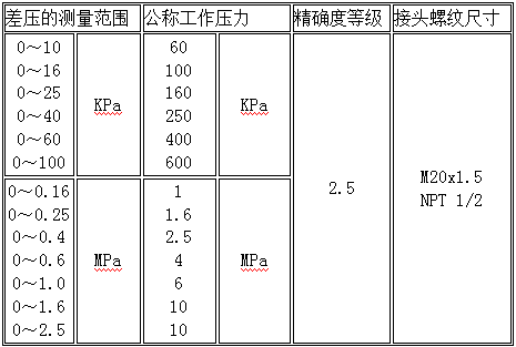 1、差压的测量范围、公称工作压力、精确度等级及接头螺纹尺寸: