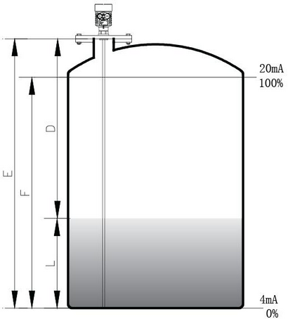 通过输入空罐高度E(=0点),满罐高度F(=满量程)及一些应用参数来设定,应用参数将自动使仪表适应测量环境。对应于4~20mA输出。
