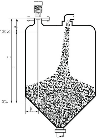 顶部盲区是指物料面与测量参考点之间的距离。 底部盲区是指缆绳底部附近无法准确测量的一段距离。 顶部盲区和底部盲区之间是有效测量距离。