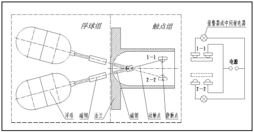 浮球在随液位升降过程中,只有当浮球处于上、下两个极限位置时,动触点才会在静触点间接通或断开,从而使外接的控制电器接通或断开,进而控制信号报警装置报警或启停电动泵。而在浮球随液位升降过程中,并无连续信号输出,只保持原有的接通或断开。